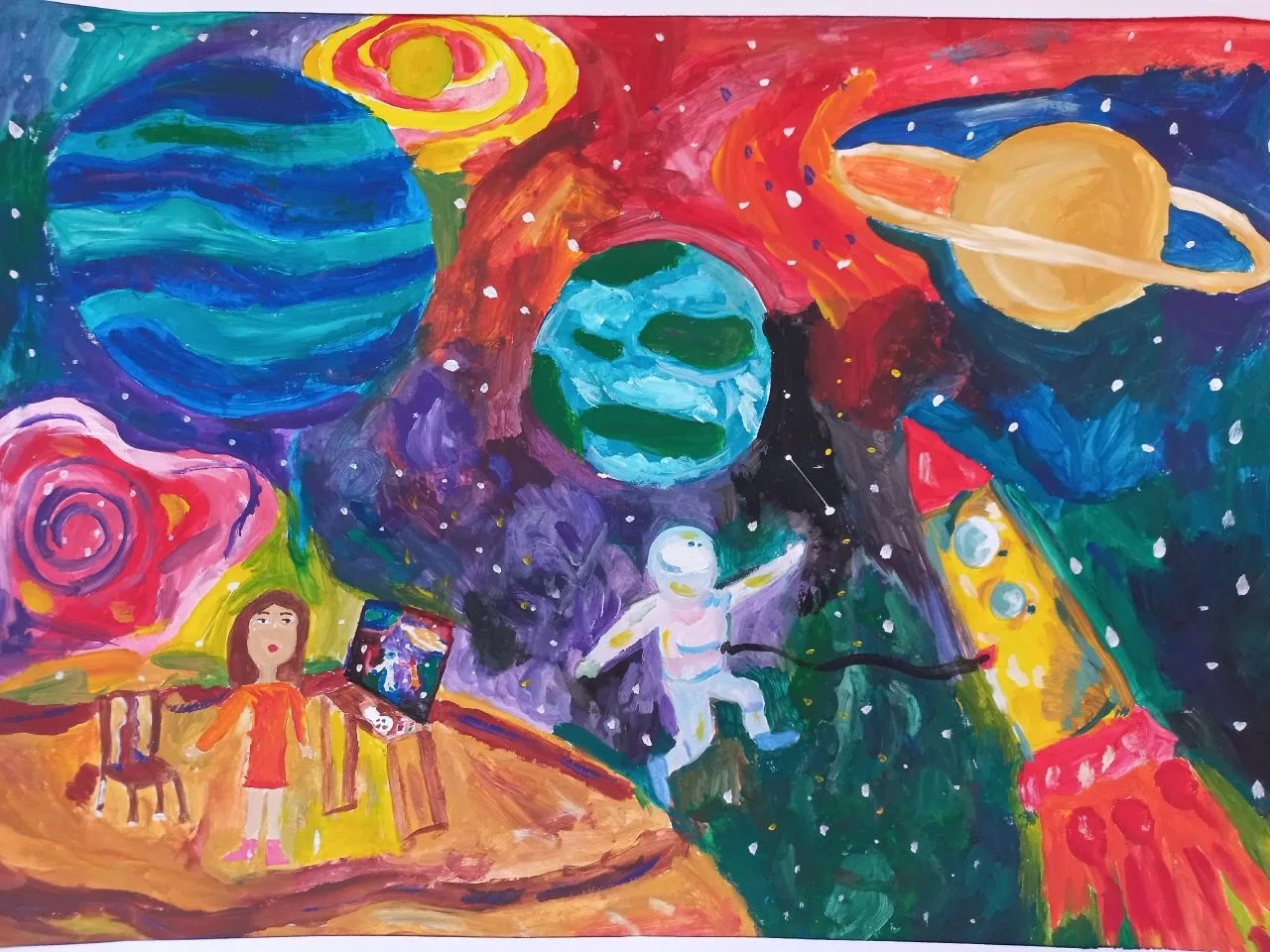 На детских рисунках мы видим загадочный мир звезд и планет, волшебное, и немного пугающее, звездное пространство, и , конечно, космонавтов.